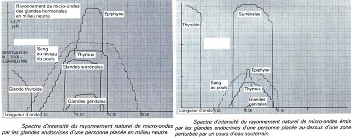 L’analyse du spectre d’intensité du rayonnement naturel de micro-ondes émises par les glandes endocrines d’une personne placée à la verticale d’un cours d’eau souterrain révèle des modifications de l’activité des glandes endocrines: