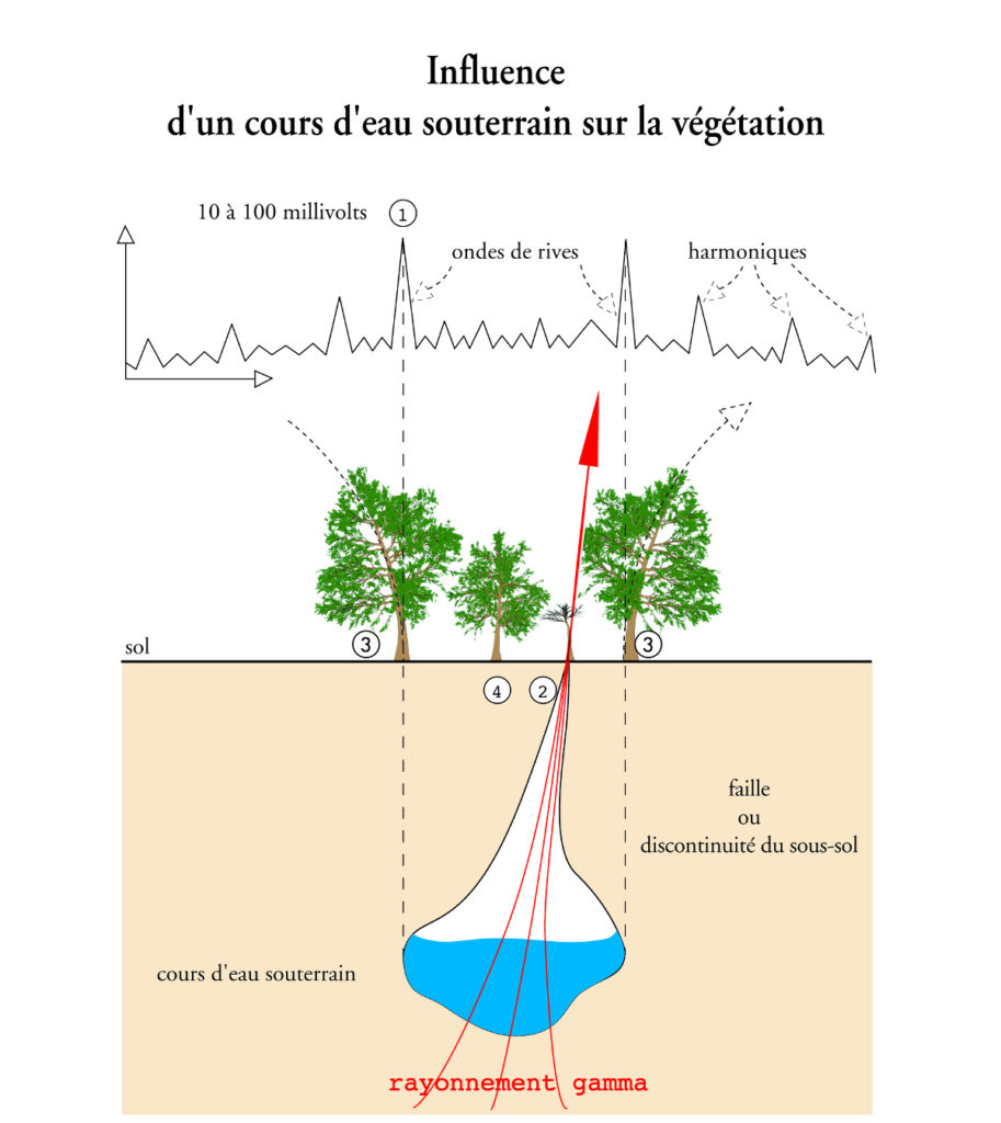 La friction de l’eau contre les parois de le la roche génère une différence de potentiel électrique (ddp) que l’on peut mesurer en surface à la verticale des rives du cours d’eau.